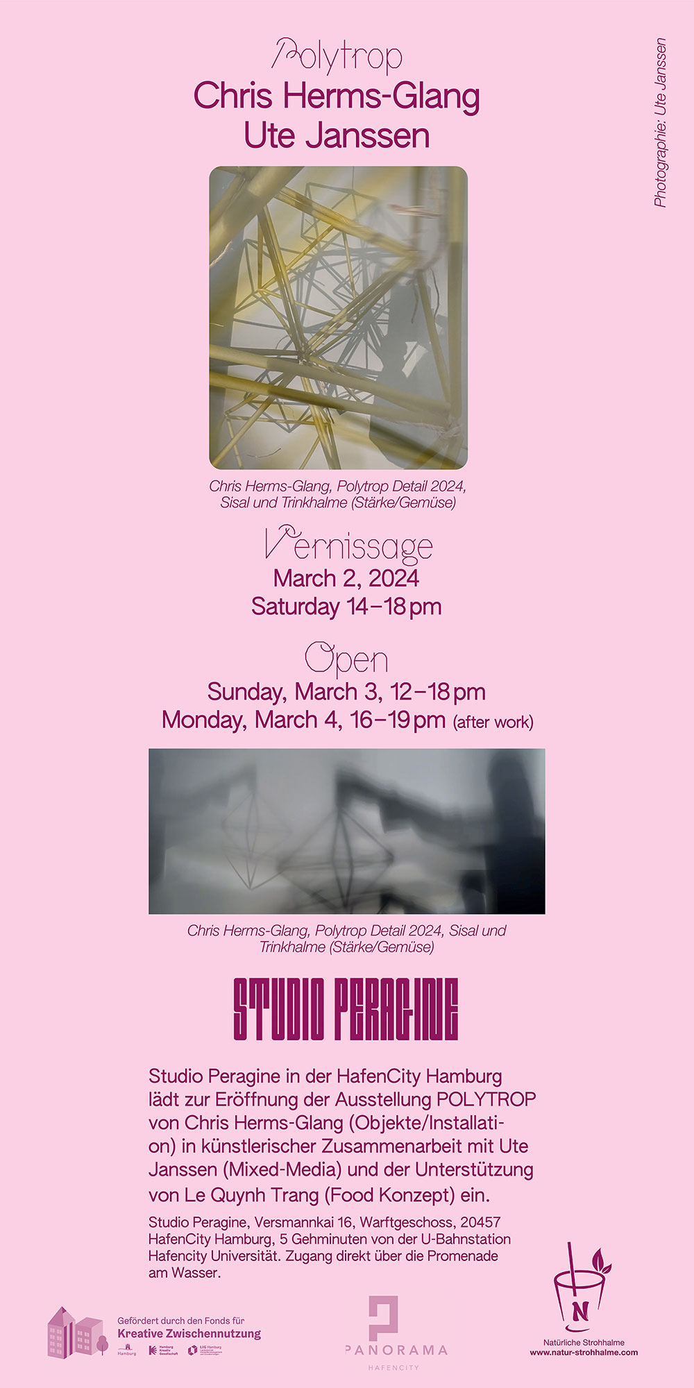 After 6 months of preparation, the Polytrop 2024 art exhibition on the topic of straws (starch/vegetable) will take place at Studio Peragine in HafenCity Hamburg.